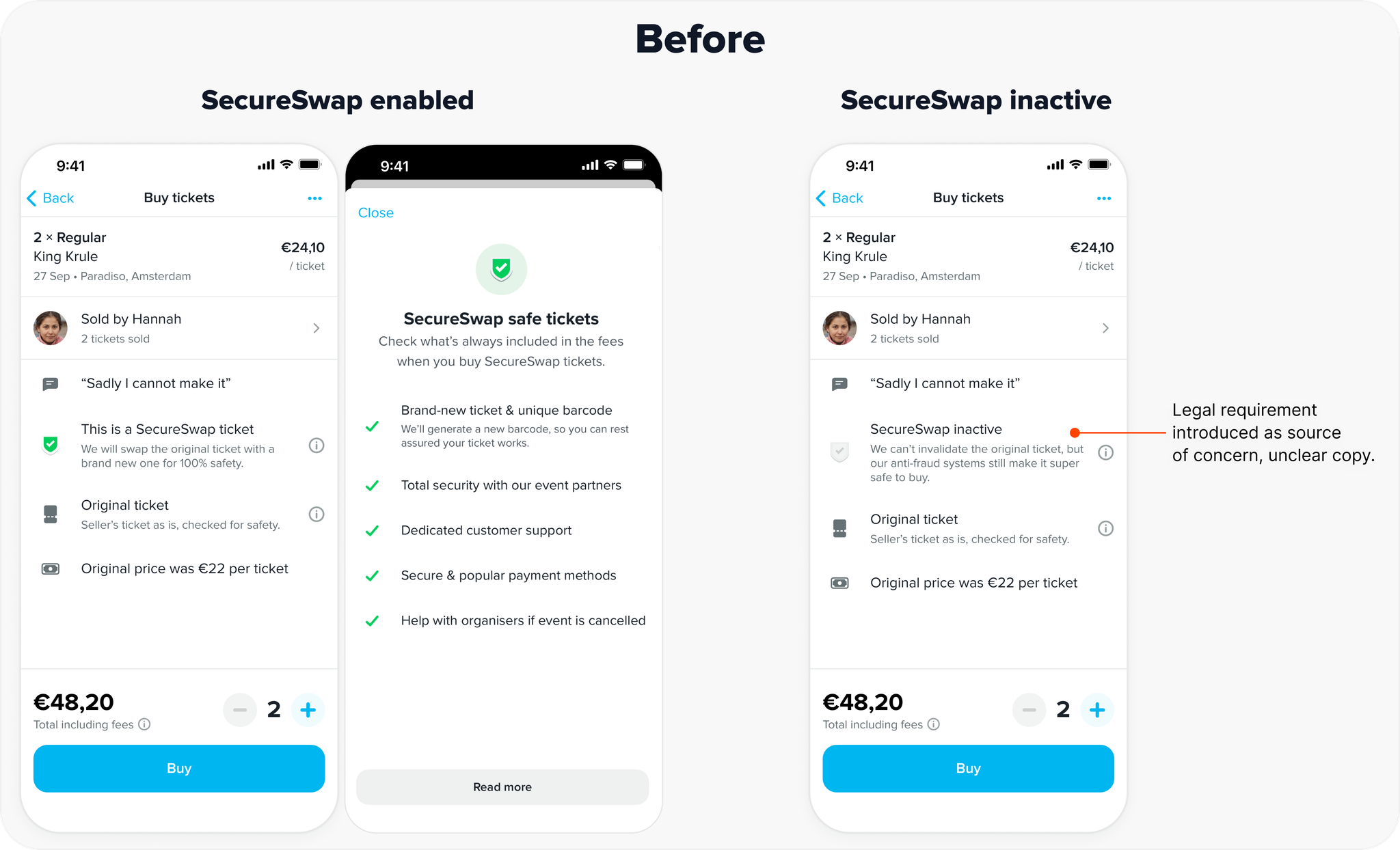 Talking to users, I realised that many showed uncertainty around TicketSwap’s existing safety guarantees. Many believed the new insurance covered protections that were already built into the platform. There was a risk that the new insurance would be misunderstood, or even that users would start to think that they were only protected if they paid extra.