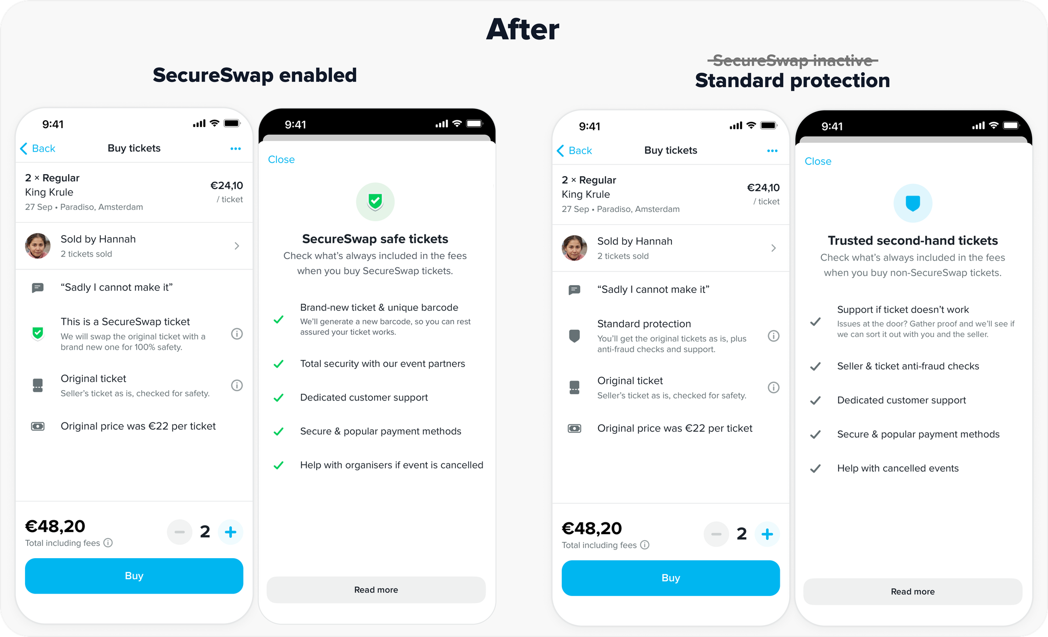 To address the issue, I introduced a clearer way of communicating our safety mechanism as part of the ticket details. With this new system, ticket safety was always presented as a selling point, reminding buyers that even when our more advanced exchange mechanisms were not enabled, they were still protected.